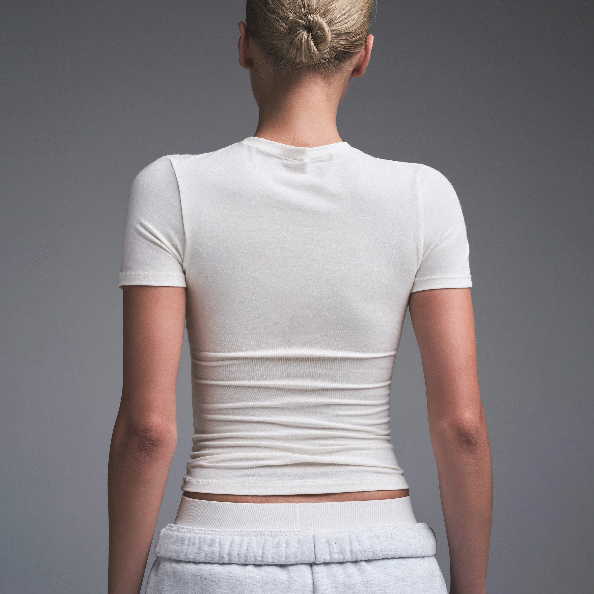 Our viral t-shirt in the cotton everyone craves. This perfect five-star tee is made with our stretchy, lightweight cotton that enhances your curves with its body-hugging fit and elevates your comfort with its incredibly soft feel. Features stitching details along the short sleeves and hem and hits below the natural waist. Fits true to size.